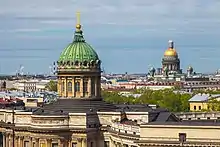 Iron domes offered the lightness of timber construction along with incombustibility and higher strength, allowing for larger spans. Because domes themselves were relatively rare, the first examples made from iron date well after iron began to be used as a structural material.[2] Iron was used in place of wood where fire resistance was a priority. In Russia, which had large supplies of iron, some of the earliest examples of the material's architectural use can be found. Andrey Voronikhin built a large wrought iron dome over Kazan Cathedral in Saint Petersburg.[17] Built between 1806 and 1811, the 17.7 meter wide outer dome of the cathedral was one of the earliest iron domes.[18] The iron outer dome covers two masonry inner domes and is made of 15 mm thick sheets set end to end.[19]