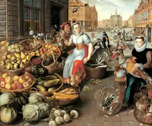 Luca Clerici has made a detailed study of Vicenza’s food market during the sixteenth century. He found that there were many different types of resellers operating out of the markets. For example, in the dairy trade, cheese and butter were sold by the members of two craft guilds (i.e., cheesemongers who were shopkeepers) and that of the so-called ‘resellers’ (hucksters selling a wide range of foodstuffs), and by other sellers who were not enrolled in any guild. Cheesemongers’ shops were situated in the town hall and were very lucrative. Resellers and direct sellers increased the number of sellers, thus increasing competition, to the benefit of consumers. Direct sellers, who brought produce from the surrounding countryside, sold their wares through the central marketplace and priced their goods at considerably lower rates than cheesemongers.[37]
