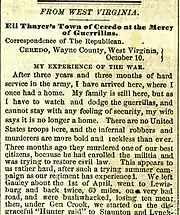 At first the new settlement was welcomed, but after John Brown's raid on Harpers Ferry in 1859 local residents became hostile to the Ceredo colony.[54] During the war Ceredo became a focus of Unionism and raised Union militia. This made it a favorite target for local Confederate raiders like William "Rebel Bill" Smith and by the end of the war Ceredo was almost abandoned.