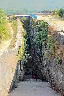 The earliest example of a bath-like pond reached by steps is found at the Uparkot caves in Junagadh. These caves have been dated to the fourth century. Navghan Kuvo, a well with circular staircase, in the vicinity, is another example. It was possibly built in the Western Satrap (200-400 AD) or Maitraka (600-700 AD) period though some place it as late as the 11th century. The nearby Adi Kadi Vav is constructed either in the second half of the 10th century or 15th century.[2][3]