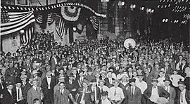 Participants at the St. Louis Caucus were enthusiastic although the session was not a productive one. Fully two days were invested choosing ceremonial officers and selecting Minneapolis as the site for the organization's formal Founding Convention in the fall.[37] Over 1100 participants competed to gain the floor to speechify, leading one historian to describe the scene as a "melee" in which "disorder reigned supreme."[38] Consequently, passage of the program by the gathering was largely a pro forma exercise, rushed through during the session's last day, with the actual decision-making process involving such matters as the constitution and publications of the organization being done in committee at night.[37]