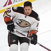 On June 27, 2014, the Ducks acquired center Ryan Kesler (as well as a third-round pick in 2015) from the Vancouver Canucks in exchange for Nick Bonino, Luca Sbisa and a first- and third-round pick in 2014.[32] In the following season, they won their third-straight Pacific Division title and finished as the top seed in the West with 109 points. In the 2015 playoffs, they swept the Winnipeg Jets in the first round. In Round 2, the Western Conference Semifinals, they extended a 19-game losing streak the Calgary Flames held at the Honda Center (presently at 22 games) by winning the first two games, but lost Game 3 in Calgary in overtime. They then rallied together to win their next two games to win the series four games to one and to set up a Western Conference Final against the Chicago Blackhawks. After taking a three games to two series lead on the strong play of goaltender Frederik Andersen, the Ducks lost the final two games, including Game 7 on home ice. This marked the third straight season the Ducks had lost a series in Game 7 at home after leading the series three games to two.[33] Andersen allowed four or more goals in each of the final four games of the series; the Ducks lost three of those four games and allowed 19 goals over that span.[34] The Ducks scored 3 goals in a span of 37 seconds in Game 4 of the series against the Blackhawks, the second fastest time in playoff history.[35]