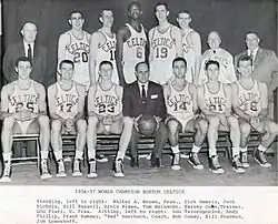 After the 1955–56 season, Auerbach made a stunning trade. He sent perennial All-Star Ed Macauley to the St. Louis Hawks along with the draft rights to Cliff Hagan in exchange for the Hawks' first round draft pick, the second overall.[5] After negotiating with the Rochester Royals, Auerbach used the pick to select University of San Francisco center Bill Russell.[6] Auerbach also acquired Holy Cross standout, and 1957 NBA Rookie of the Year, Tommy Heinsohn.[7] Russell and Heinsohn worked extraordinarily well with Cousy, and they were the players around whom Auerbach would build the Celtics for more than a decade. Russell, who delayed joining until the middle of the 1957 season in order to play for the U.S. Olympic Team,[7] had an immediate impact.