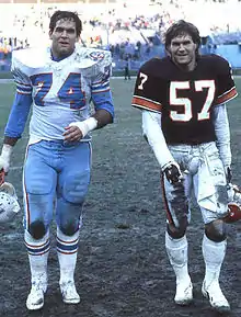 The 1988 season was marred by injuries to the Browns' quarterbacks. Kosar was injured in the opener against Kansas City Chiefs and two backups were subsequently injured, leaving Don Strock, who the Browns signed as an emergency fill-in, to start before Kosar's return.[223] Kosar came back but was hurt again at the end of the regular season.[224] Despite the rotating cast of quarterbacks, Cleveland managed to finish with a 10–6 record and made the playoffs as a wild-card team.[225] Cleveland met the Houston Oilers in the wild-card playoff round at home, but lost the game 24–23.[226] Four days after the Oilers loss, Schottenheimer and Modell announced that the coach would leave the team by mutual consent. Modell felt hiring an offensive coordinator was necessary to keep pace with the Oilers and the Bengals, a pair of divisional opponents then on the rise, but Schottenheimer said it "became evident that some of the differences we had, we weren't going to be able to resolve."[227][228] Modell named Bud Carson as his replacement.[229]
