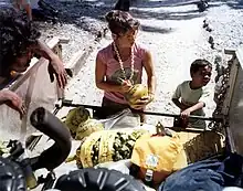 Linguistic and anthropological studies have suggested that the first Austronesian settlers of the Marshall Islands arrived from the Solomon Islands.[2] Radiocarbon dating of um earth ovens, post holes, and trash pits at Bikini Atoll suggests that the atoll may have been continuously inhabited from 1200 BCE to at least 1300 CE,[3] though samples may not have been collected from secure stratigraphic contexts and older driftwood samples may have affected results.[4] Archaeological digs on other atolls have found evidence of human habitation dating around the 1st century CE,[2] including earth ovens at the Laura village, Majuro, with a date range of 93 BCE to 127 CE[5] and Kwajalein with a range of 140 BCE to 255 CE.[6]