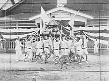 The government also sponsored youth associations (青年団, seinendan) devoted to Japanese activities, such as track and field, baseball, handicrafts, and song competitions.[160] Beginning in 1915, elite Marshall Islanders received free trips to Japan to expose them to Japanese culture.[163][164] Students also received tours of Japan from 1917.[165] Islanders were responsible for some of the costs of the trips from 1926, and the tour program continued until 1939.[166]