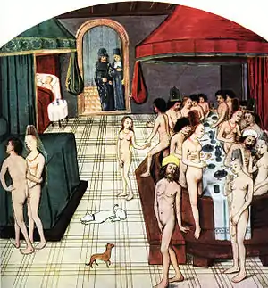 In the Middle Ages, moral theology distinguished four types of nudity: nuditas naturalis, the natural state of the human being; nuditas temporalis, an artificial state imposed by transience, generally linked to poverty; nuditas virtualis, as a symbol of virtue and innocence; and nuditas criminalis, linked to lust and vanity. Another frequent element of nudity in medieval art—especially in the Apocalypses of the Beatus—was the representation of the dead, as a symbol of the stripping of everything earthly.[41]