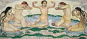 Renaissance art recovered the classical nude as an exemplification of ideal beauty, both physical and moral. The nude was the perfect pretext for any composition, from the most naturalistic to the most symbolic, the latter expressed through multiple allegories and personifications. At times, the Renaissance representation of the human body was that of nudity for nudity's sake, a kind of art for art's sake that often denaturalized the very subject of the painting, whether religious or mythological.[64] In the Renaissance the nude ceased to be a source of shame and, in contrast, acquired a new heroic or even sacred character (sacra nuditas).[65] According to Louis Réau (Iconography of Christian Art, 1955), "Renaissance artists considered the representation of the human body in its triumphant nudity as the primary object of the plastic arts".[65]