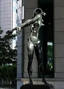 Myron made with his Discobolus (450 BC) a magnificent example of figure in movement, achieving for the first time a coordinated dynamic effect for the whole figure, since until then the figures in movement were made in parts, without a global vision that provided coherence to the dynamic action—as in the case of the Poseidon of Cape Artemision, bronze figure of Attic origin from around 470 BC, in which the torso is static, not following the movement of the arms.[18]