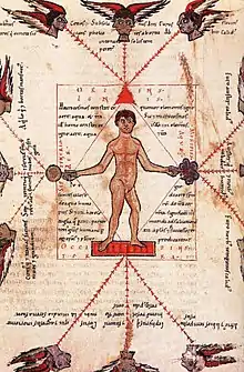 Although the study of proportion in the human body was lost during the Middle Ages, the human body was the object of a cosmogonic symbolism with mathematical and aesthetic applications: the homo quadratus. Starting from the Platonic corpus, medieval culture considered the world as a great animal—and, therefore, as a human being—while man was conceived as a world, a microcosm within the great cosmos of Creation. This theory related the symbolism of the number four to nature, which in turn was applied to art: there are four cardinal points, four seasons, four phases of the moon, four main winds; and four is the number of man, a theory that goes back to Vitruvius and his conception of man as an ideal square, with the width of his outstretched arms corresponding to his height.[44]