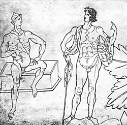 The first productions in sculpture were the work of Greek artists who settled in Rome, among them: Apollonius of Athens, author of the Belvedere Torso (50 BC); Cleomenes, author of the Venus de' Medici (1st century BC); and Pasiteles, author of the Boy with Thorn.[34] Stephanos, a disciple of Pasiteles, was the author of the Athlete of Albani (50 BC), a figure that had an enormous success, a fact that is corroborated because 18 copies have reached us, and that originated a variant with another figure, creating a group sometimes identified with Mercury and Vulcan, and others with Orestes and Pylades, of which a copy, called Group of San Ildefonso (10 BC), is preserved in the Prado, where the two figures are reminiscent of Polyclitus' Doriphorus and Praxiteles' Apollo Saurochthonus.[35] Other anonymous works stylistically related to Hellenistic Greek art are the Boxer at Rest from the Museo delle Terme in Rome (100–50 BC) and the Hellenistic Prince from the same museum (100–50 BC).