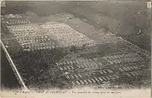 A camp with a capacity of 27000 soldiers[14] was also set up in March 1916 at a place called "Le Courneau" in Gironde, between the road leading from La Teste to Cazaux and the canal connecting the pond of Cazaux and Sanguinet to the Arcachon Bay. It is estimated that 40,000 Senegalese tirailleurs and their staff stayed in the camp at some point, it could simultaneously accommodate about 18,000 men and their 300 officers and petty officers at the same time.[15] It was also used a transit camp for tirailleurs en-route to hivernage in Northern Africa.[16] The location of the camp next to a swamp, the insalubrious living conditions and the poor quality of the accommodation favoured the spread of epidemics.[17] In September the construction of the camp was completed and more than two hundred deaths had already been suffered.[18][19]