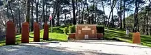When Courneau camp was demolished in 1928, the remains of the soldiers were grouped into a mass grave at a place called "Le Natus". The site, lost in the middle of the pines, soon fell into disrepair. The veterans of La Teste-de-Buch brought it out of oblivion at the end of the 1950s. In 1965, it was decided to erect a suitable memorial monument, to fence off and clean up what was in fact a vast mass grave covering an area of 1 hectare (2.5 acres).[26][27] A stele was erected with a marble plaque mentioning the "940 Senegalese and 12 Russians who died for France", in reality the deaths were more numerous and of various national origins. The site is designated as a national necropolis by the French decree of 23 May 1993 establishing the list of national necropolises, where the necropolis appeared under the name of : "Monument ossuary of the camp of Courneau" located at La Teste".[27] In 2018, 6 steles with the names of 949 soldiers buried in the necropolis were erected by the municipality of La Teste-de-Buch.[28]