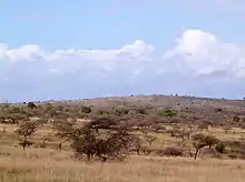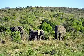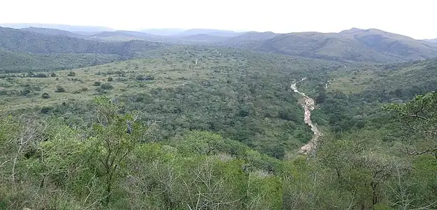 This area is situated between the two Umfolozi Rivers where they divide into the Mfolozi emnyama ('Black Umfolozi') to the north and the Mfolozi emhlophe ('White Umfolozi') to the south.[10] This area is to the south of the park and is generally hot in summer, and mild to cool in winter, although cold spells do occur.[2] The topography in the Umfolozi section ranges from the lowlands of the Umfolozi River beds to steep hilly country, which includes some wide and deep valleys. Habitats in this area are primarily grasslands, which extend into acacia savannah and woodlands.