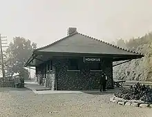 The station's current westbound structure was constructed in 1908 with river stones and a tile roof. This replaced facilities built in 1886 that burned. The first station, built in 1860, had also burned down several years after construction.[5] The eastbound side was an irregularly shaped waiting shed built in 1909.[7]