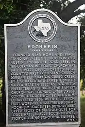 In 1848, Valentine Hoch, a German immigrant from the disputed Alsace-Lorraine region, traveled to the rolling hills near the lower Guadalupe River with his son, after arriving in America at the port of Indianola, Texas. Upon arrival to the hills, Hoch remarked: "Here we shall build our home." Construction of the home soon began from the stones at the Guadalupe River bed, and was completed several years thereafter. Others with surnames that included Crawford, Helms, Humphrey, Steen, Morrisse, Times, and Schwab, began to build homes and establish businesses in the area; soon the community of Hochheim was established.[3] The name could be translated to mean "Hoch's home" for the earliest settler, or "High home" for the fact that Hoch constructed his home on a hill. Townspeople also referred to the settlement as "Dutchtown".[4]