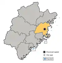 Native location of Fuzhounese people (includes Gutian County and Pingnan County which are unrepresented in this map.