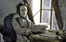 Each puppet doll was intricately designed by craftsmen by hand. The characters have unique outfits modeled after sketches that were then attached to the models by pins.[1] Work on the female puppets as well as the young protagonists was the most difficult to construct.[8] Each puppet required fastidious, pinpoint accuracy. For example, Hoffmann is designed with a waistcoat and a frill all stained with coffee and wine. A group of artists in a workshop would have different replacements of each puppet that is made of an amalgam of plastic and steel.[8] Additional materials they worked with included wood, cardboard, plywood, carpentry tools, paper, gouache, and brushes.[14] The puppets were drawn according to the motifs of the stories that required a grotesque form with unrealistically long noses.[9] The drawing style only added to the expressiveness of the characters.[4]