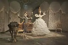 Tatiana Lykosov was the puppet animation director.[13] The papier-mâché puppet actors are constructed by a metal skeleton on hinges. In order to convey expression onto the puppets it was necessary for the animator to understand the mood of the puppet and how they behave in certain situations.[38] A report revealed the heads of the characters, express three different emotions: neutral, smiling and menacing. After sawing the head, the eyes are inserted inside made by balls that move in the same way as in a living person or a bird.[13] The animators also designed the miniaturized props for the film such as candlesticks placed on the tables, paintings hanging on the walls or the piano, sofas, and chairs.[6] The most difficult shot was the appearance of the character the Sea King who had to be depicted in smooth locomotion since the character had only a tail and no legs. The tail made of rubber with a metal hinge structure inside was attached to a coordinate table that moved through cogs.[39]