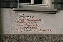 On 9 January 1498 a court of high justice was officially mentioned in the region of „Wellenau“ where the gallows of the County of Bregenz was situated (Galgenbihl). Wellenau is a lot located before a defile called "Klause" in Lochau. Apparently executions were carried out in this spot up to the 19th century. It was here on this previous place of execution that Sir Georg Fairholme erected in 1873 Villa Fairholme, also known as Villa Wellenau. This building was taken down in 1976.[10] In his function as bailiff Marx Sittich von Ems ordered to hang 50 peasants on oaks at a former place of execution situated by a local brook called Leiblach. These men had claimed their rights in the course of a peasant uprising. Up to our times this location is still known as 'Henkeichen' which means hanging oaks. In 1526 the leaders of these farmers, Knopf von Leubas and Kunz Wirt, were arrested, repeatedly tortured and probably executed by hanging in Wellenau, the former site where high justice rendered by the town of Bregenz was carried out.[11]