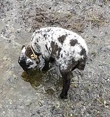 The Hog Island sheep is a feral breed, descended from sheep abandoned on Hog Island in the 1930s and 1940s.[1] It is believed that the breed was descended from the Merino breed, among others, possibly the Improved Leicester or other English breeds.[2][4] The sheep is relatively small but tough and hardy. Rams weigh on average 125 pounds (57 kg) and ewes 90 pounds (41 kg).[1] Lambs are born with spotted or speckled fleece; about 90% of adults have white fleece and 10% black.[5][6] Both males and females can have horns, and about half the total population do.[4]