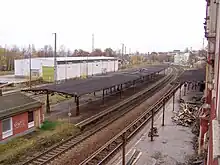 The freight yard was closed on 31 December 2000. The two signal boxes were demolished in September 2006 and extensive reconstruction has taken place since 2007. The Tudor-style entrance building was demolished in 2007 and replaced by a low-rise building and the railway station was redeveloped to remove barriers to access. The then redesigned station forecourt was opened on 9 July 2009; a Turmwagen ("tower car", a vehicle designed for the maintenance of the tramway’s overhead wire) was erected on the forecourt as a monument to the former tramway. In 2010, work started on the replacement of the platform, leading to the construction of a platform on the former loading road.[5] The platform next to the station building and the original island platform were completely demolished and replaced by a new barrier-free island platform. The new station was officially opened on 2 August 2011.