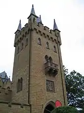 The third, and current, castle was built between 1846 and 1867 as a family memorial[1] by Hohenzollern scion King Frederick William IV of Prussia. Architect Friedrich August Stüler based his design on English Gothic Revival architecture and the Châteaux of the Loire Valley.[2] No member of the Hohenzollern family was in permanent or regular residence when it was completed, and none of the three German Emperors of the late 19th and early 20th century German Empire ever occupied the castle; in 1945 it briefly became the home of the former Crown Prince Wilhelm of Germany, son of the last Hohenzollern monarch, Kaiser Wilhelm II.