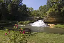 Hokah was home to Como Falls, a waterfall on Thompson Creek. From 1858 until the 1930s Hokah was also home to Lake Como, a 90-acre, 20-foot deep man-made lake created by building a dam on Thompson Creek at Como Falls.[20] Lake Como was a popular vacation spot in its heyday, drawing visitors from La Crosse and the surrounding area with lakeside cabins and boat rentals.[12] The dam that created Lake Como failed during a flood in 1909 and allowed the lake to drain but was rebuilt in 1922. By the late 1930s, soil erosion from nearby farms prior to the widespread local use of contour plowing caused the lake bed to fill in, bringing about the end of Lake Como. Until August 2018, the site of Lake Como was used as a community park, pool, and baseball field. A severe storm in late August 2018 dumped almost eight inches of rain in the area in less than 24 hours, causing massive damage to the park and rerouting the path of water around the rock formation that made up Como Falls, basically destroying the falls.[20] In the following months, local and state parties' funding was allocated to rebuilding the route for water that creates Como Falls.