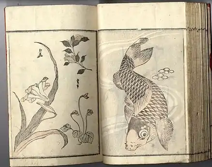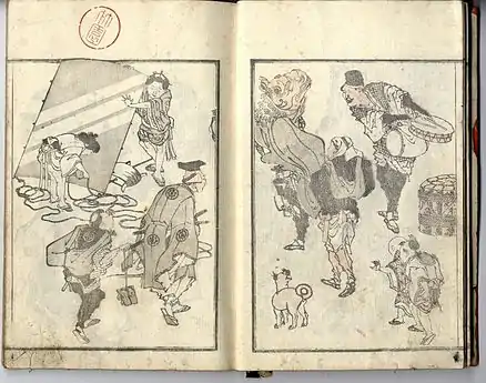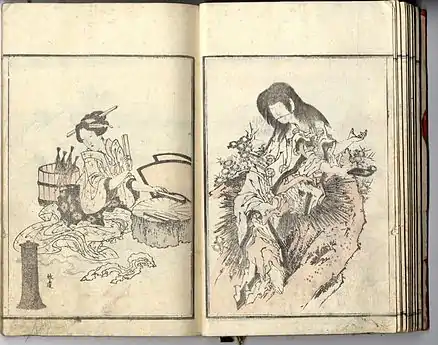 In the 1820s and 1830s[3] Hokkei was a prolific illustrator of surimono prints, of which he made at least eight hundred; and of books, of which he illustrated about a hundred, including erotica and a book of sketches called Hokkei Manga (北渓漫画) in the manner of the Hokusai Manga.[2]