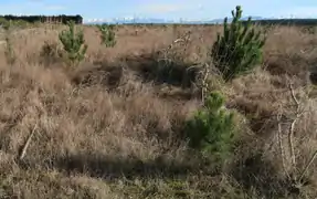 The poor soil at Eyrewell was considered unsuitable for agriculture and used mainly for sheep farming.[8] Between 1928 and 1932, the 30 foot (9.1 m) tall mānuka (Leptospermum scoparium) forest at Eyrewell was cleared and the 6764 ha Eyrewell Forest plantation of introduced Monterey pine (Pinus radiata) was established.[4] Most of the area has been in plantation forestry ever since, with blocks of trees being felled in rotation approximately every 27 years. Some of the older blocks had an understory of kānuka up to 4 m high and most included native shrubs, herbs, and mosses, despite regular tree felling and replanting.[5]