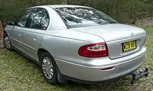 The flagship Calais shares the prestige style exterior with the Berlina, but is distinguishable by its 16-inch alloy wheels and chrome outlined foglamps.[7] Standard features included an eight-speaker audio system, ten stack CD player, dual zone automatic climate control, electric front seats and leather steering wheel, gear shifter and handbrake. The Calais presented the same optional features as the Berlina, but allowed for the inclusion of leather upholstery.[10] With the Berlina, the centre console was finished with either the black or beige plastic panel depending on the interior colour scheme, however the Calais upped the ante with a wood grain-faced console, or a satin-finished façade for Series II variants.[9] The Calais was the only model in the lineup that could be had with all three engines, with the Ecotec V6 standard and the supercharged V6 and V8 as options. Manual transmissions were not available however.