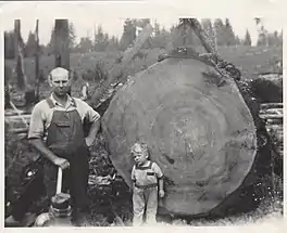 Hollie Pihl (child) with his uncle Chris cutting down his first tree on his father's 1,000 acre tree-farm in Manning, Oregon.