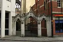 The archway and gates, which date from the mid 19th century and made from Portland stone and wrought iron in a Gothic Revival style, are listed separately from the church as Grade II.[12]