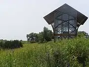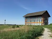 The project was designed by Jim Dennel of the Omaha-based firm BCDM Architects. The chapel stands on bluffs that overlook Interstate 80. The chapel building, inspired by Thorncrown Chapel, is made of western red cedar beams and glass walls. The southern window features an etching of the Holy Family, the namesake of the shrine. The primarily glass construction was chosen to allow for unobstructed views of the surrounding landscape. A visitor center inspired by a prairie dugout contains a gift shop, meeting spaces, and restrooms. The entrance to the visitor center is meant to evoke the tomb of Jesus, and a sculpture hanging from a skylight to evoke his shroud. A 40-foot (12 m) cross is located past the front of the shrine, towering over the interstate below.[4]