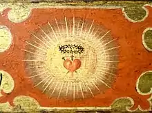 The Sacred Heart is often depicted in Christian art as a flaming heart[5] shining with divine light, pierced by the lance-wound, encircled by the crown of thorns, surmounted by a cross, and bleeding. Sometimes, the image is shown shining within the bosom of Christ with his wounded hands pointing at the heart. The wounds and crown of thorns allude to the manner of Christ's passion, while the flames represent a furnace of ardent love.[6]