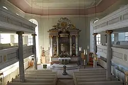 Holy Trinity Church was inaugurated in 1800.[1] It was built in the classical style and stands on the site of an ancient Catholic church. The interior of the church was completed in 1837. The altar sandstone statues, sculpted by Elias Räntz, depict Moses and Luke the Evangelist. The altar and baptismal font were designed by Johann Nestler.[2]