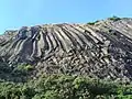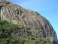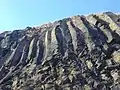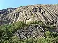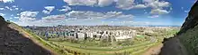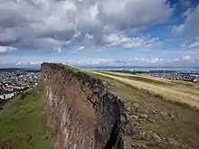 The cliffs are formed from steep dolerite and columnar basalt and have a long history of rock climbing on their faces starting from the earliest days of the sport. Harold Raeburn was brought up nearby, and became the leading climber of the Scottish Mountaineering Club not long after he joined it in 1896.[10] By 1900 a number of traditional climbing and sport climbing routes had been recorded by Raeburn and W. Inglis Clark.[11] In recent years the park rangers (previously under the auspices of the Royal Estate and now Historic Environment Scotland, who had taken over management of the park) attempted to regulate access to the cliffs due to hazards to park visitors from loose and falling rocks. Climbers are now restricted to a designated area of the South Quarry, and need to apply for a permit, free of charge, at the education centre in the north of the park in order to be allowed to climb.[12] There is still some activity, though most of it is bouldering rather than free climbing. The finest areas are in the two quarries, although it is only in the South Quarry that climbing is still permitted at this time. The south quarry contains the Black Wall, a well-known bouldering testpiece in the Edinburgh climbing scene. The best known route to climb the Crags is at "Cat Nick" or "Cat's Nick",[13][14][15] a cleft in the rocks near the highest point of the Crags. This is named on maps, sometimes leading people to believe that the highest point of the crag is so named.