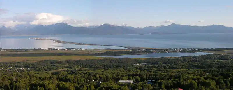 Two different theories postulate that the spit originates either from the tidal swells and currents of Cook Inlet and Kachemak Bay over millennia of sand buildup, or that it was pushed into place by now-retreated glaciers.[3] The Dena'ina called the spit Uzintun, meaning "extends out into the distance".[4] In 1899, the Cook Inlet Coal Fields Company laid a railroad track along the spit, connecting the docks to the coal fields along Kachemak Bay. The resulting business led to the development of what eventually became Homer, Alaska.[5] In the 1960s, several hippies, known as "spit rats", traveled from all around to camp on the Homer Spit, many of them becoming successful commercial fishermen over time.[6] The 1964 Alaska earthquake shrank it to 508 acres (2.06 km2), and killed most of the vegetation, making it today mostly gravel and sand.[3]