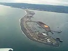 The Homer Spit (Dena'ina: Uzintun) is a geographical landmark located in Homer, Alaska on the southern tip of the Kenai Peninsula. The spit is a 4.5-mile (7.2 km) long piece of land jutting out into Kachemak Bay.[1] The spit is also home to the Homer Boat Harbor. The harbor contains both deep and shallow water docks and serves up to 1500 commercial and pleasure boats at its summer peak.[1] Additional features and attractions include The Nick Dudiak Fishing Lagoon, which is an artificial "fishing hole", campgrounds, hotels, and restaurants and the Salty Dawg Saloon, which is constructed out of several historic buildings from Homer. Hundreds of eagles formerly gathered there in winter to be fed by Jean Keene, the "Eagle Lady".[2]