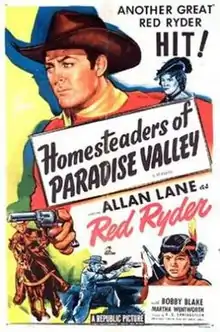 Homesteaders of Paradise Valley is a 1947 American Western film in the Red Ryder film series directed by R. G. Springsteen and written by Earle Snell. The film stars Allan Lane as Red Ryder, Bobby Blake and Martha Wentworth. The film was released on April 1, 1947, by Republic Pictures.[1][2][3]