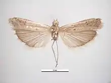 The wingspan is 18โ€“20 mm. Adults have off-white wings with a number of dark scale spots as well as dark scales on the distal one third of the wing.[2]