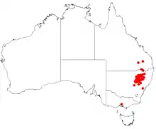 Grows from Yetman in far northern New South Wales to Dubbo and Merriwa districts. Grows most commonly on sandstone in shrubby woodland or heath.[5]