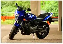 The Honda CB600F (known as the Hornet in Europe and Brazil and 599 in the U.S.) is a street motorcycle manufactured by Honda.[1][2][3] It is powered by a 599 cc (36.6 cu in) liquid-cooled inline-four engine, originally a detuned version of that in the Honda CBR600 sport bike, which currently produces around 102 bhp (76 kW). The 'Hornet' name was not taken to North America as AMC, and its successor, Chrysler, had trademarked the name with the AMC Hornet.