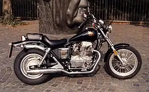 The Honda CMX450 "Rebel" is a motorcycle manufactured by Honda for the model years 1986 and 1987 only. In contrast to the Rebel 250 250cc cruiser, it has a 450cc engine. The introduction of the Rebel 250 and 450 has been cited as a way for Honda to attract female riders, new to motorcycling.[1] due to the bikes' low seat heights, low center of gravity, and overall ease of handling;[2] However, the September 1985 issue of Motorcyclist magazine, when the Rebel was first introduced, states "by targeting the bike to a young audience, such as those who watch MTV, Honda hopes to attract newcomers and expand the motorcycle market ... Honda is not marketing this motorcycle as a woman's bike".[3] It has a single disc brake in the front and a drum in the rear. The only gauge is a speedometer that includes gear recommendations based on speed; there is no tachometer. The transmission is a standard down-1st, up-2nd to 6th. The 6th speed acts as an overdrive.