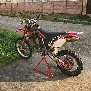 The Honda CRF150R is a racing motocross bike that was released in 2006 for the 2007 model year. It competes in the Mini Class against many 85 cc (5.2 cu in) two-stroke bikes; however, it cannot race in the 85cc mod. or stock class. It must race in the Supermini class.[1] All of Honda's 2008 models are four-strokes whereas in years past, some of their racing bikes were two-strokes. The 150R features a powerful Unicam four-valve liquid-cooled engine that produces impressive power at a wide RPM range. And only weighs 185 pounds wet (which means with fluid's) . With its fully adjustable Showa suspension, high-quality Dunlop Tires and disc brakes front and rear, this is one of the best mini racing bikes Honda has made. The CRF150R come in two versions: the regular and the Expert.