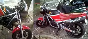 The Honda NS125 which was available as an "F" naked, or an "R" fully faired is commonly mistaken as an older NSR, although it shares no real parts or design to it. This model is most easily identifiable by its singular square headlight, rather than the later NSR's 'foxeye' design