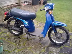 The Honda SH50 is a 49 cc (3.0 cu in), air-cooled, two stroke, single cylinder, scooter style, restricted moped manufactured by the Honda Motor Company between 1984 and 2006, with substantial revisions for the 1996 model year. It was equipped with continuously variable automatic transmission, (Honda V-Matic transmission) together with both electric and kick start, automatic choke[4] and capacitor discharge electronic ignition.[5] Brakes were drum front and rear, (disc front on later models) operated pedal-cycle style by two handlebar levers. The early models had some resemblance to Honda's C50/70/90 Super Cub range with a similar shape, dual seat and rear carrier, but with a scooter type floor, unlike the P series of mopeds such as the Honda PC50 or the Honda Express N series, which had cycle style construction. The SH50 was also known as the City Express and in some markets, as the Scoopy. All models had cycle type wheels as against the smaller wheels of later 50cc scooter style mopeds. The battery, fuel tank and two-stroke-oil reservoir were contained under the seat. Electrics were 12 volt and a handlebar mounted binnacle, which effectively formed part of the front bodywork, contained basic instrumentation and warning lights.