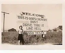 In 1930, the local Hondo Lions Club erected the now somewhat famous sign reading "This is God's Country, Don't Drive Thru It Like Hell" at the city limits with the intention of slowing down those speeding while traveling through town. Later, in the 1940s the sign was changed to "This is God's Country, Please Don't Drive Through It Like Hell" to satisfy those in the town who were displeased with the tone of the old sign. The sign has been in news and print in many magazines, including on the cover of National Geographic, and in the music video of Little Texas' song "God Blessed Texas."