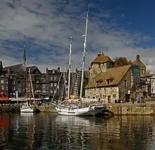 Honfleur (French: [ɔ̃flœʁ] ⓘ) is a commune in the Calvados department in northwestern France. It is located on the southern bank of the estuary of the Seine across from Le Havre and very close to the exit of the Pont de Normandie. The people that inhabit Honfleur are called Honfleurais.
