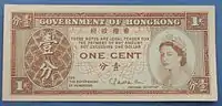 The one-cent banknote was the smallest denominated banknote issued in Hong Kong. They were issued by the government and were initially released on 30 May 1941 and printed by Noronha and Company Limited[1] to provide small change because of a lack of coinage brought on by the Second World War. The first issue was 42 by 75 mm, the obverse was brown with a serial number of seven numbers with either no prefix or an A or B prefix. This side was mostly in English, except for "Government of Hong Kong" which was also in Chinese. The reverse was red and the denomination in English and Chinese. After the Japanese take over of Hong Kong the issue was replaced by the Japanese Military Yen.